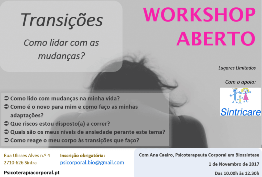 No passado dia 1 de Novembro, estive em Sintra a facilitar o workshop aberto “Transições – Como lidar com Mudanças”, com o objetivo de divulgar a Psicoterapia Corporal em Biossíntese. Deixo aqui o resultado da entrevista feita pela Sintricare, para perceber melhor como as mudanças nos podem afetar. O que a motivou a desenvolver o workshop aberto […]